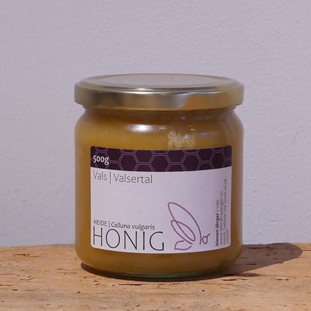 Dieser rare Heidehonig aus dem Valsertal ist eine echte alpine Spezialität. Der Honig stammt vorwiegend von der Blüte der Heide (Calluna vulgaris), im Volksmund auch Erika genannt. Diese Heide blüht vom Juli bis September.